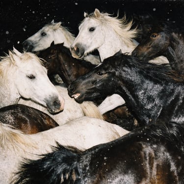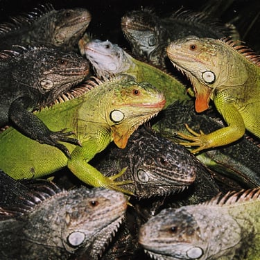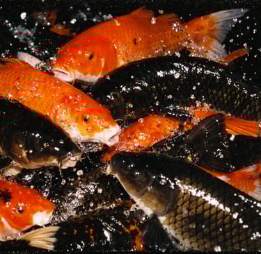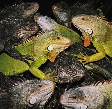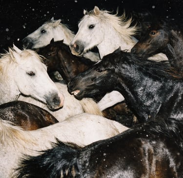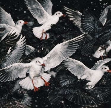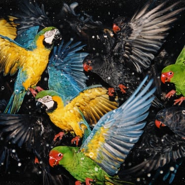 A dense group of [ANIMAL], mid-[ACTION], overlapping bodies, strong contrast between [COLOR 1 + ANIMAL] and [COLOR 2 + ANIMAL], frozen action with crisp detail