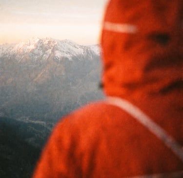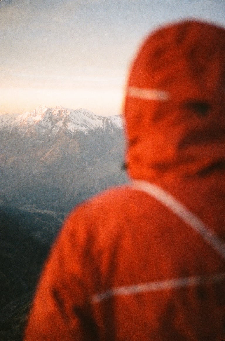 A blurred hiker in a bright red waterproof jacket with reflective piping stands in the foreground, hood up, facing distant sunlit, snow-dusted peaks. Camera angle: Over-the-shoulder shot, with the jacket soft and out of focus in the right foreground, and sharp mountain detall in the left middle third. Texture & Light: Shallow depth of field gives the jacket a glowing, dreamilke blur. Warm light washes over the fabric. The mountains are crisp, making the scene feel cinematic and fleeting. Film aesthetic: Captured on 35mm film with direct flash, visible grain, lens haze, color shifts (green shadows, amber highlights), and imperfect cxposure. Styling Tags: Kodak Portra 400, Cinestill 8001, analog imperfections, off-kilter framing. Output: 3:4