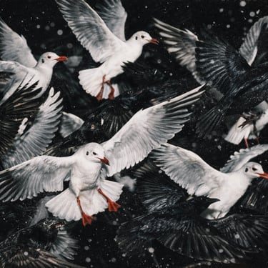 Direct on-camera flash freeze-frame photography, 1/250s shutter, wide aperture, shallow depth of field, 50mm lens physics, hard flash falloff, specular highlights on feathers, slight motion blur on wing tips, film grain, mild halation, tiny flash overexposure on whites, Polaroid instant film look, high contrast, chaotic energetic mood