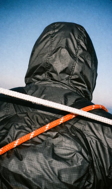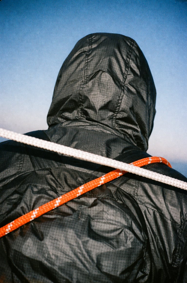 Captured on 35mm film with harsh direct flash and cinematic imperfections. A straight rear-facing hiker wearing a matte black/grey ultralight hooded shell jacket made from grid-patterned ripstop nylon, the hood pulled fully up. The jacket has crinides and feels angular in nature. A bright orange and white rope and white white rope cross diagonally across the back, is present in the frame. The camera angle is: Tightly framed from just behind at upper back height, centered symmetrically. The white rope cuts across the visual plane, breaking up the symmetry and adding tension. The lighting: low-contrast midday light grazes the ripstop grid structure,
