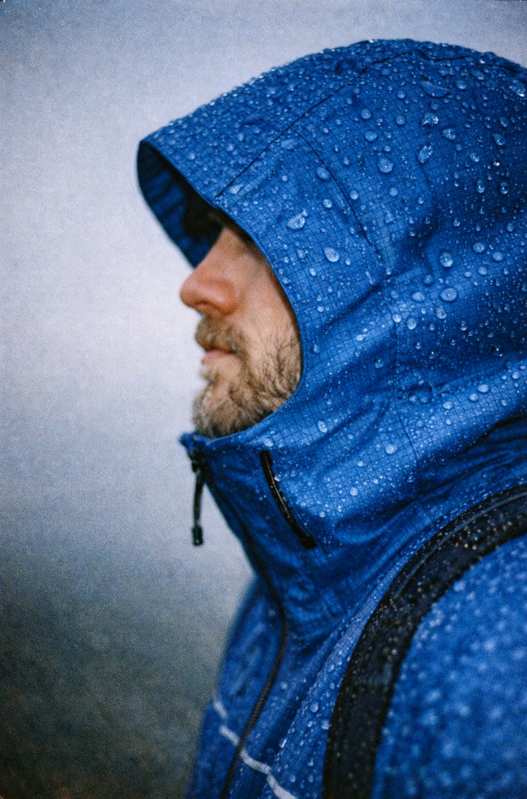 A macro close-up side profile of a male hiker wearing a crinided blue 3-layer waterproof jacket with the hood fully up. Raindrops bead on the matte, grid-textured fabric with visible sean taping, Shot tightly from eye level, cropped above the chest, with the face in the left third of frame and soft grey sky behind. The hood forms a cocoon-like silhouette. Overcast lighting enhances moisture and texture. The composition is tilted and off-balance, evoking a candid, moody feel. Fim aesthetic: Captured on 35mm film with direct flash, visible grain, subtle lens haze, color shifts (green shadows, amber highlights), and imperfect exposure. Styling Tags: Kodak Portra 400, Cinestill 800T, direct flash, analog imperfections, off-kilter framing. Output: 3:4